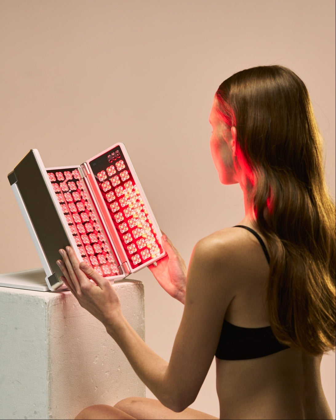 A: Set up your device, position yourself in front of the panel. Alternatively, you can place the panel directly on the affected area. For the face, we recommend using the panel at a distance of between 6-12 inches.